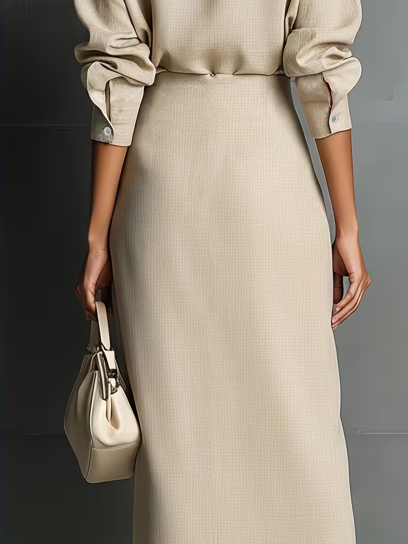 Style: An Elegant Commuter aesthetic with a classic long-sleeved shirt-style top.